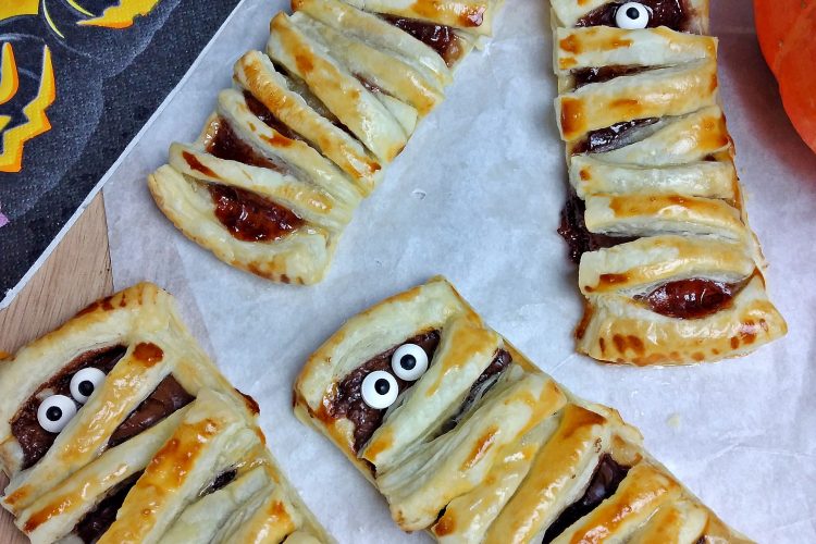 Die Halloween Blätterteig Mumien kommen ganz bestimmt auf jeder Halloween Feier gut an.