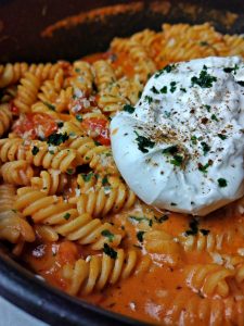 Schnelligkeit: Das ist heutzutage für viele ein ausschlaggebener Punkt, ob ein Gericht gekocht wird oder nicht. Bei diesem Gericht ist die Tomatensauce in wenigen Minuten fertig, während die Nudeln nebenan gar gekocht werden. Die Burrata Kugel kommt vor dem Servieren auf das Gericht. So hat man den puren, cremigen Geschmack der einzelnen Komponenten auf dem Teller.