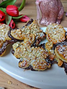 Kombiniert mit cremigem Schokoaufstrich, einer goldenen Eiglanz-Schicht und knusprige Haselnussstücken entsteht daraus ein Gebäck, das aussieht, als käme es direkt aus der Konditorei. Tatsächlich sind sie Kinderleicht in der Zubereitung und schon in wenigen Minuten hat man hier etwas leckeres für den Ostertisch. Die kleinen Kunstwerke kannst du in süße Osterformen wie Hasen, Eier, Blumen oder Schmetterlinge ausstechen – das sorgt für extra Feststimmung auf dem Tisch und ist immer schön anzusehen.