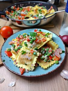 Heute stelle ich dir meinen momentanen Favoriten vor, wenn es um ein gesundes und sättigendes Mittagessen geht. Hierbei liebe ich vor allem die schöne bunte Vielfalt an Gemüse, zusammen in einer cremigen leichten Sauce. Dazu passen gefüllte Nudeltaschen perfekt dazu. Hier kannst du, wie ich, das Rezept mit frische Ravioli zubereiten. Eine andere Variante wäre in dem Fall, statt der Ravioli mit Tortellini oder Tortelloni. Egal für welche Nudelvariante du dich entscheidest, es wird immer köstlich schmecken!