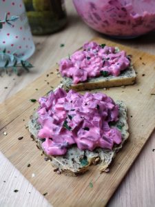 Der Salat selbst besticht durch seine leuchtende Farbe, die sofort ins Auge fällt. Im Geschmack überrascht der Salat mit einer angenehmen Süße, dafür sorgt vor allem die fruchtige Note vom klein gewürfelten Apfel. Ich liebe diese Kombination wirklich sehr, daher ist sie auch fester Bestandteil in meinem Rezept. Die säuerliche Note kommt direkt von den Gewürzgurken, die ebenfalls fein gewürfelt mit im Salat untergemischt sind. Hier nutze ich auch sehr gern das Gurkenwasser, dass übrigens auch sehr gut für den Darmhaushalt ist. Also nie einfach so weg gießen!